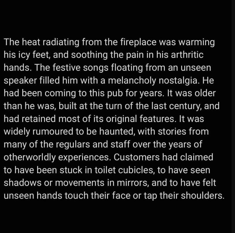 For decades, Harold has spent every Christmas Eve at his local pub, enjoying the festive cheer despite the eerie tales shared by the locals. But this year, something is different. As the night unfolds, Harold encounters some very familiar faces—faces he never expected to see again. What begins as a typical Christmas Eve quickly spirals into a chilling and unforgettable experience.